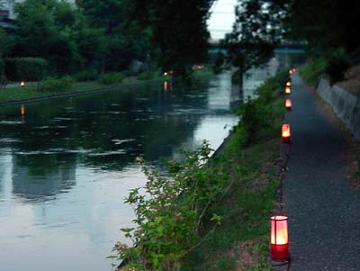 38度.....あまりの暑さに日中は表に出る気もおこらないでの夕暮れ時に散歩コースのお気に入り、高瀬川沿いの散策路を歩いていたら、花灯篭が飾られていて川面に写る灯かりがきれいでした。